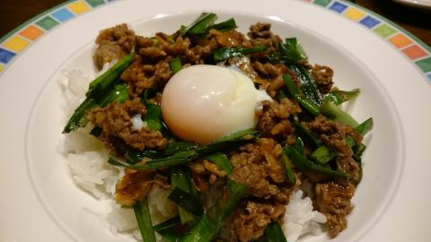 途中でニラを加え、温泉たまごと一緒にご飯に乗せて出来上がり♪